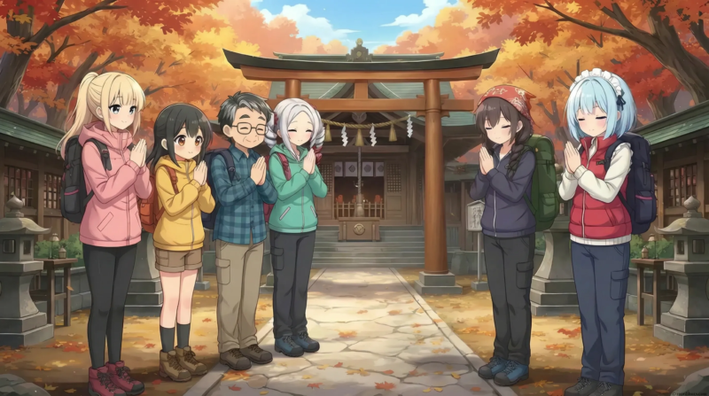 息を切らしながらも、一行はついに山頂にたどり着いた。木々に囲まれた広場の奥には、古びた鳥居と、小さな祠が静かに佇んでいる。