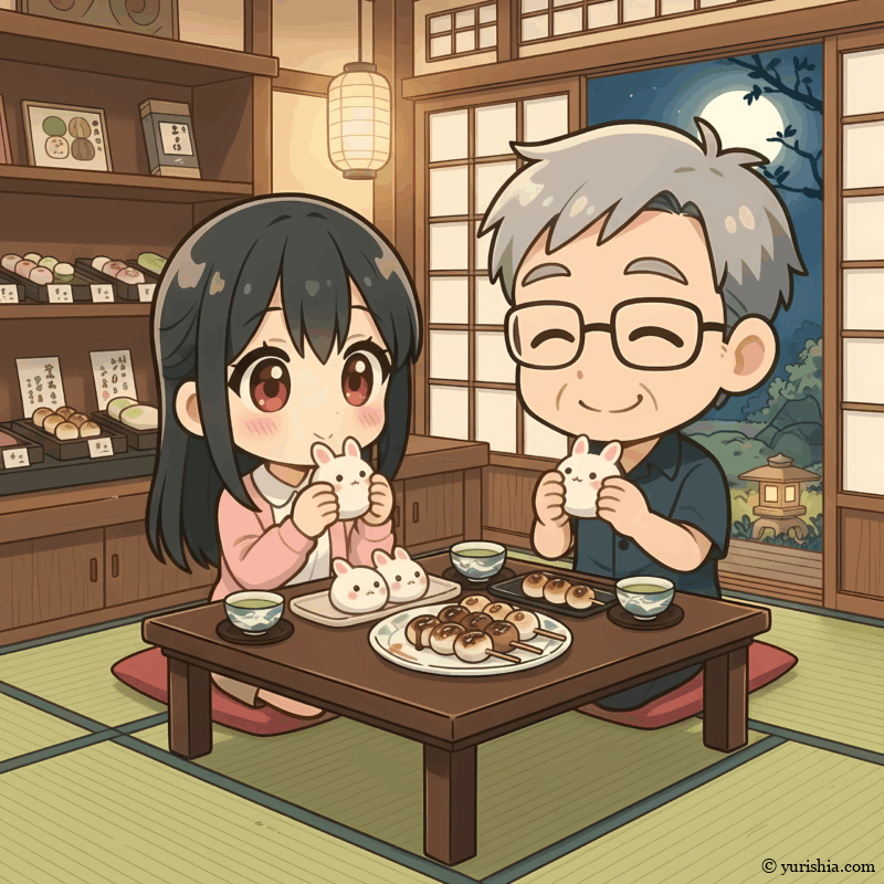 二人で並んで歩く、月明かりの道。老舗の和菓子屋の店先には、うさぎの焼印が可愛らしいお饅頭が並んでいた。