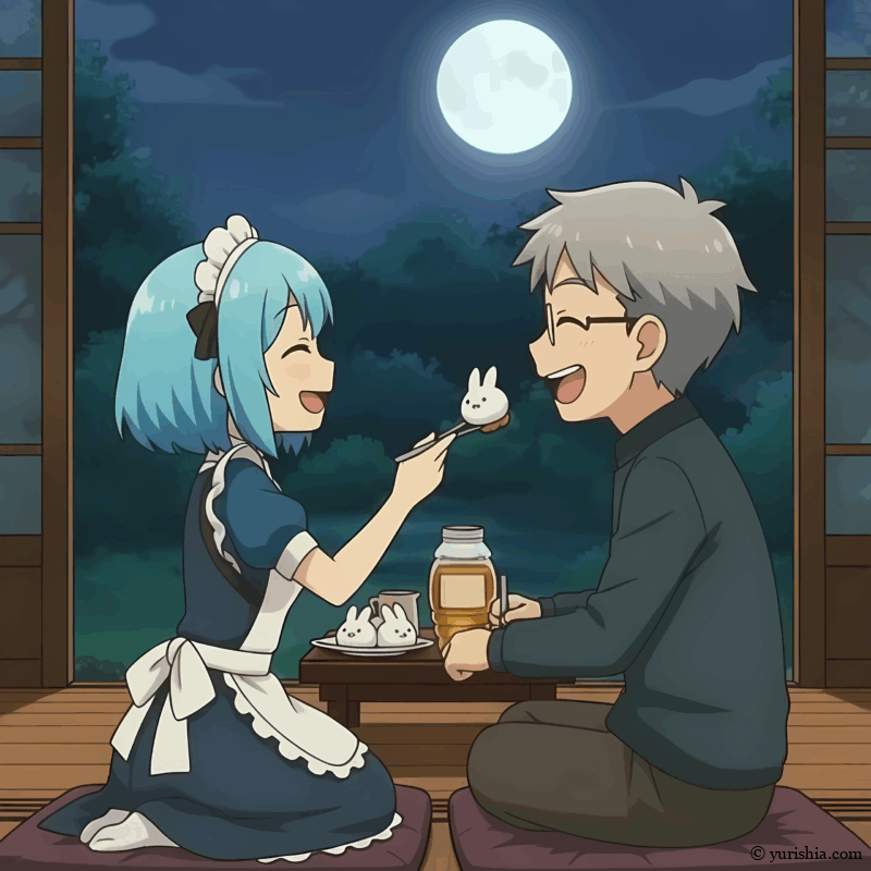 ユリシアは和を縁側へといざなうと、彼の隣にちょこんと座り、ほかほかの白い蒸しパンを差し出す。シロップが月に照らされて、きらきらと光っている。